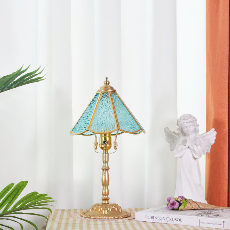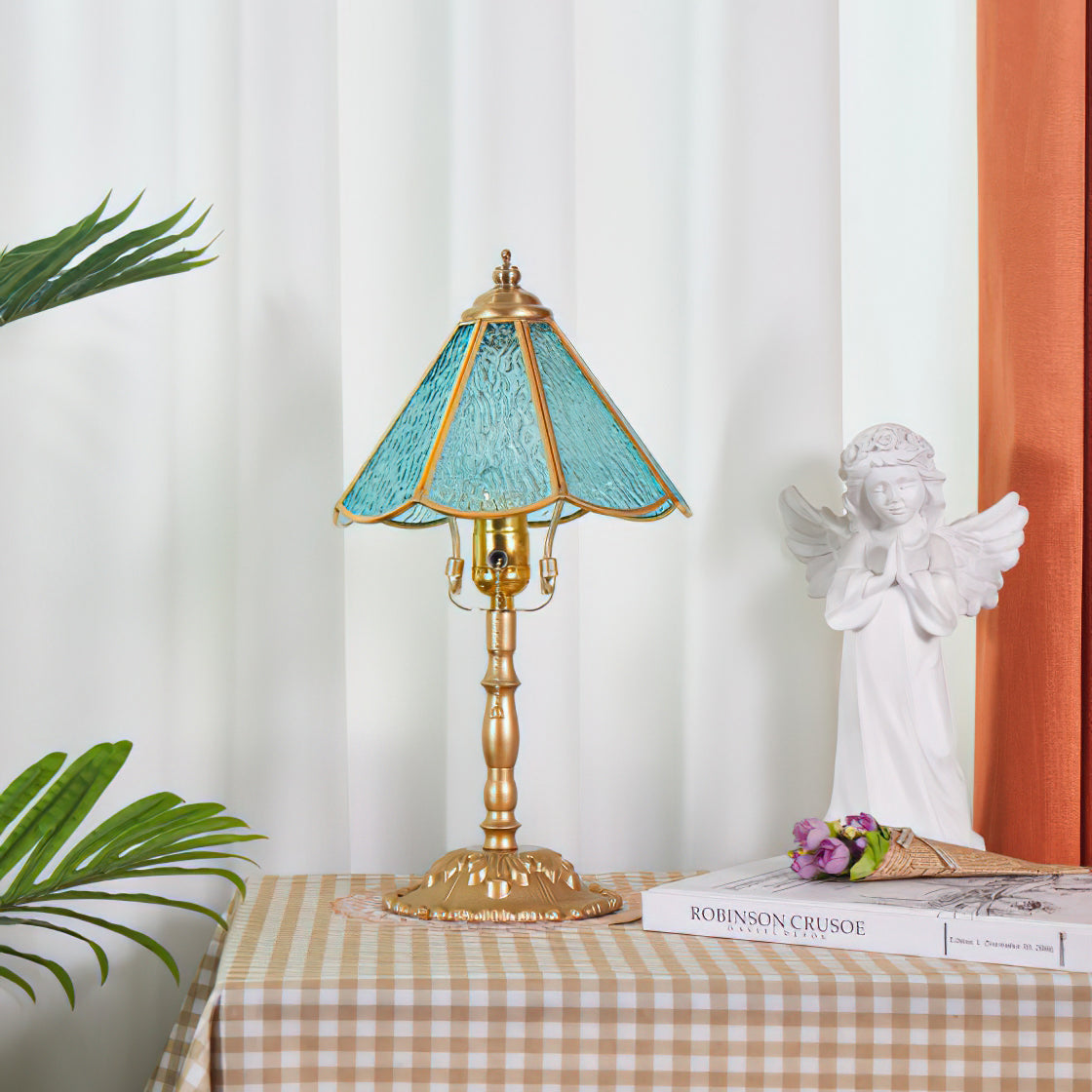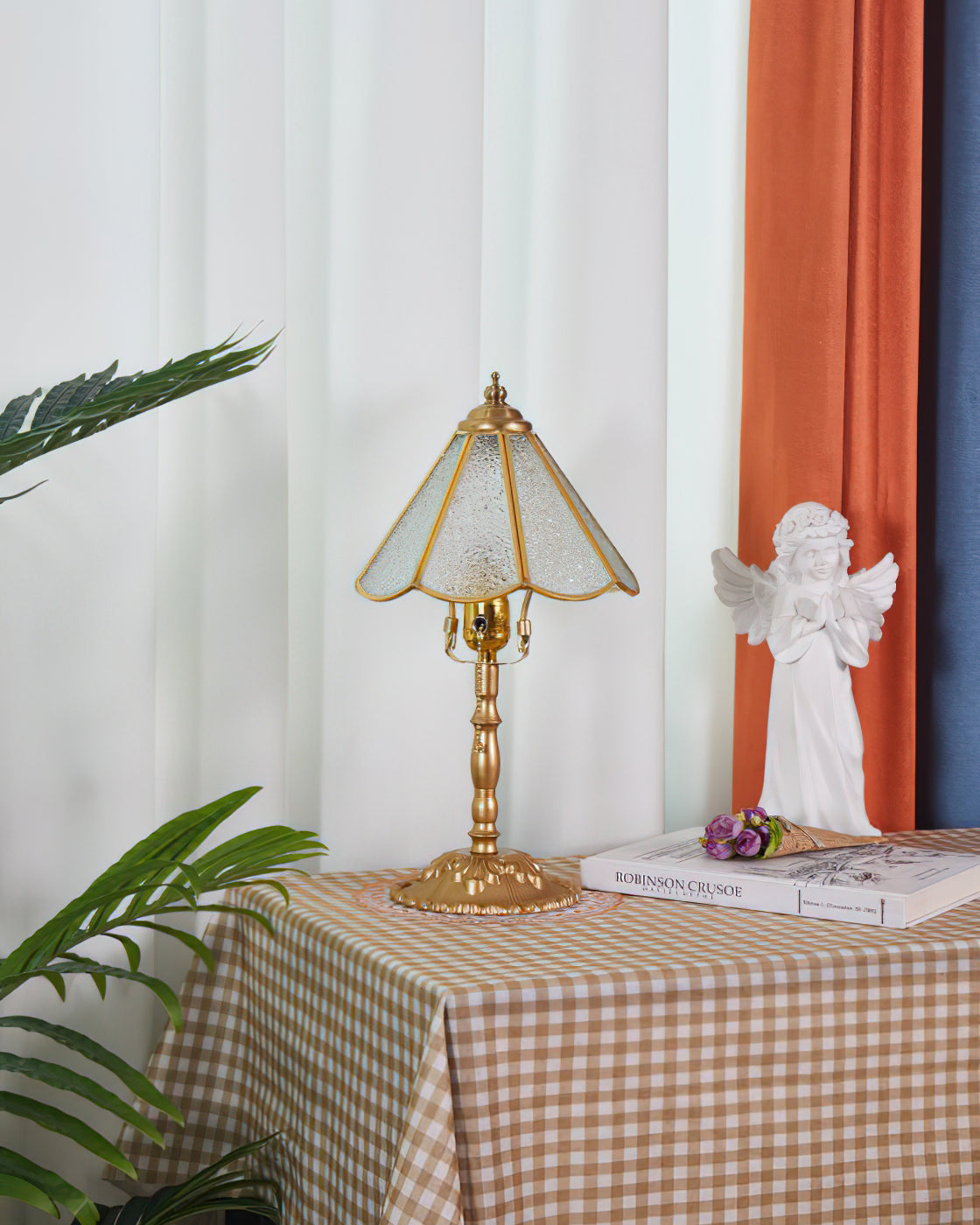 The Leslie Table Lamp combines a stunning vintage design with modern functionality. Crafted from glass and metal, it provides a warm glow, making it an ideal choice for both ambient lighting and decorative purposes.